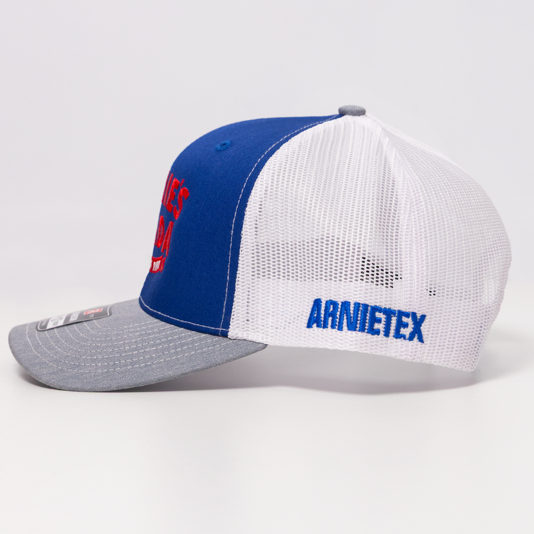 Blue Arnie's Asada cap with embroidered red logo. Richardson 112.